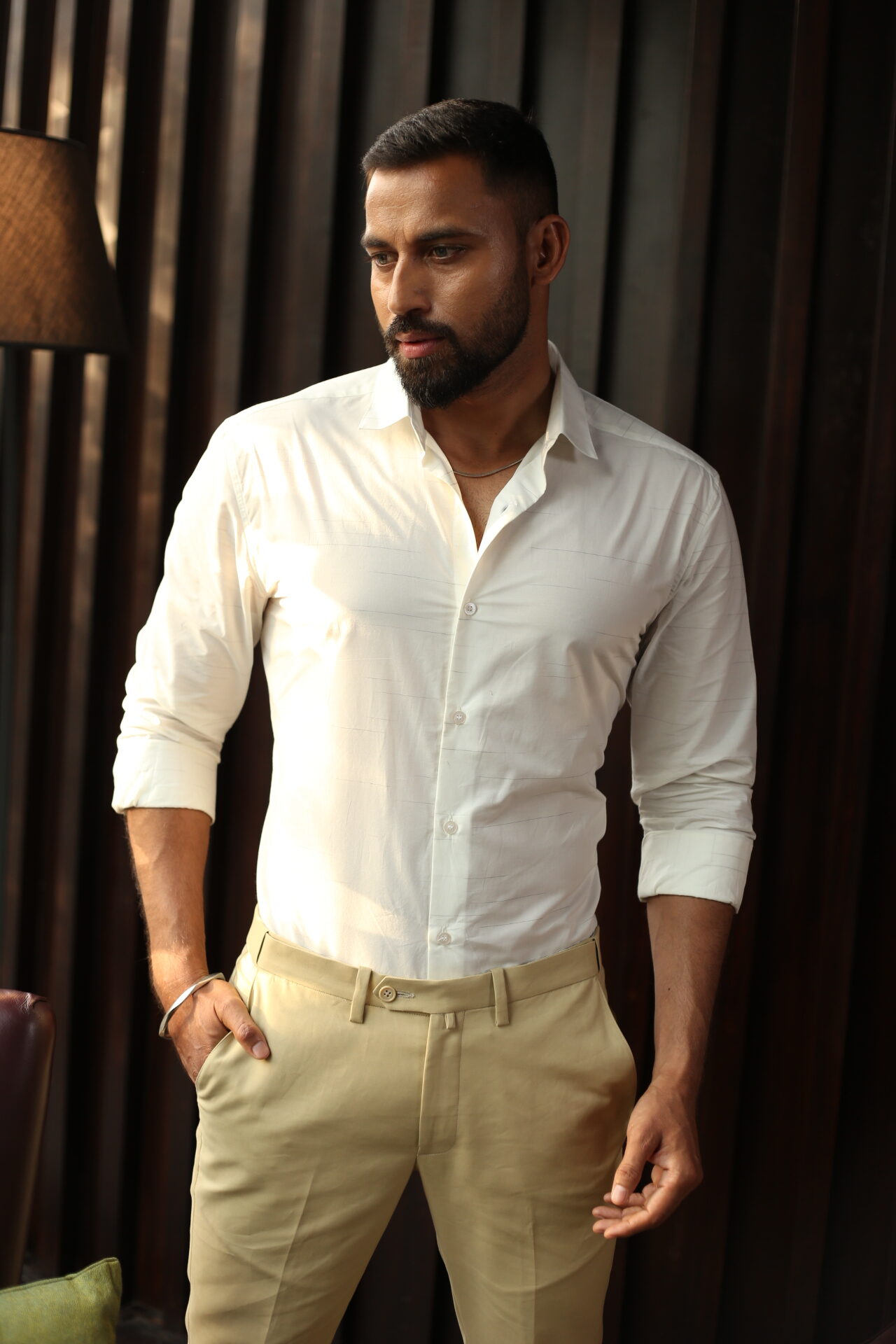 Elegant white shirt with tailored beige trousers for a clean, classic formal look.